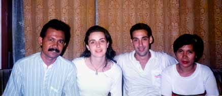 To the right is the first orangutan we saw in the jungle. It was in Central Borneo, and was a place dedicated to returning orphaned orangutans to the wild.This one sort of fell/dropped to the ground, approached Pauline and held his arms WIDE out to be picked up. Below is Nanda and his wife with Pauline and me.