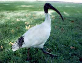 This is an ibis. I was just hanging around the Sydney Botanical Gardens, reading a book. Then I looked up and saw this bird RUNNING towards me. I have no idea what he was thinking. He ran up to me and around me, and then ran away. If he had any idea how ridiculous he looks, I'm sure he would be more shy. |
